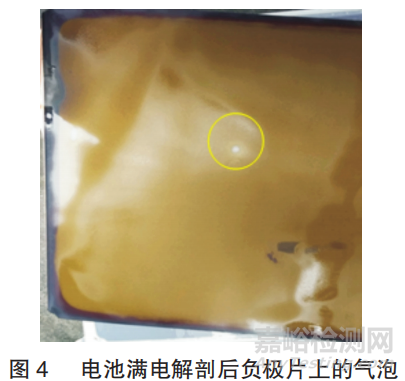 將上述3只電池在滿電狀態(tài)下解剖,氣泡處外觀如圖4所示。從圖4可以看出,與正常區(qū)域相比,化成后氣泡中心是白色,說明此處發(fā)生析鋰,周圍有一圈暗灰色過渡,說明此處碳層較厚,鋰離子未完全嵌入,剛好與圖1對應。