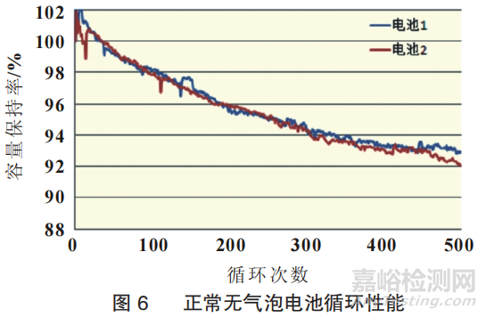 將表2中的正常電池循環(huán)數(shù)據(jù)與表1中的有氣泡電池循環(huán)數(shù)據(jù)對比,可以看出消泡措施全面實施后,正常電池循環(huán)500次的容量保持率平均高于有氣泡電池2%以上,證明了消泡措施的實施對電池循環(huán)壽命有很大的提升。