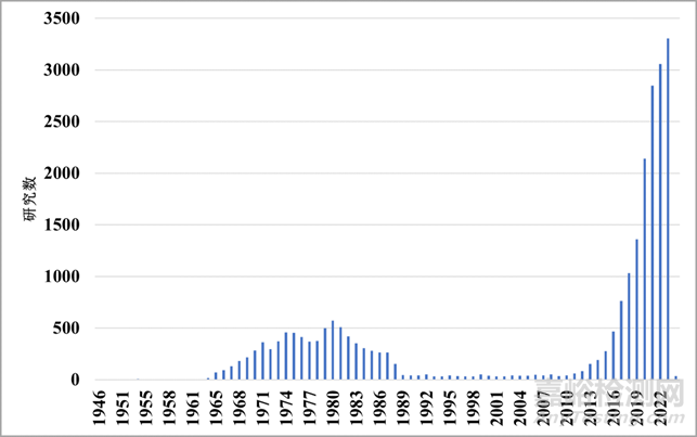 1966-1988年間首次出現(xiàn)爆發(fā)(研究數(shù)>50篇),歸因于通過細胞解離和再聚集實驗來描述器官發(fā)生的經(jīng)典發(fā)育生物學實驗的研究。類器官研究的復興在2010年后,但形式有所不同:類器官被定義為干細胞生長的3D結構,由器官特異性細胞類型組成。