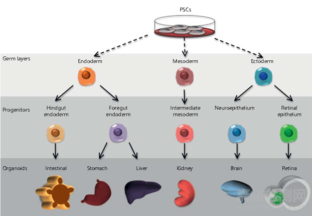 類器官來源于多能干細胞(pluripotent stem cells (PSCs))(胚胎干細胞、誘導多能干細胞(iPSC))和成體干細胞。其中,胚胎干細胞有一定的倫理問題,而腫瘤患者穿刺等活檢也可以是類器官來源之一。多能干細胞在3D培養(yǎng)過程中可聚集形成擬胚體,并誘導分化產(chǎn)生外胚層、中胚層和內胚層后最終形成特定組織的類器官。