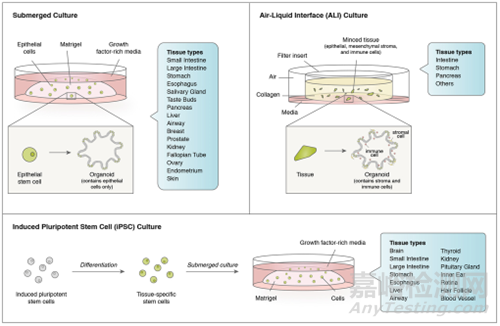 目前采用的類器官方法包括浸沒式培養(yǎng)、氣液界面培養(yǎng)和誘導多能干細胞中產(chǎn)生。