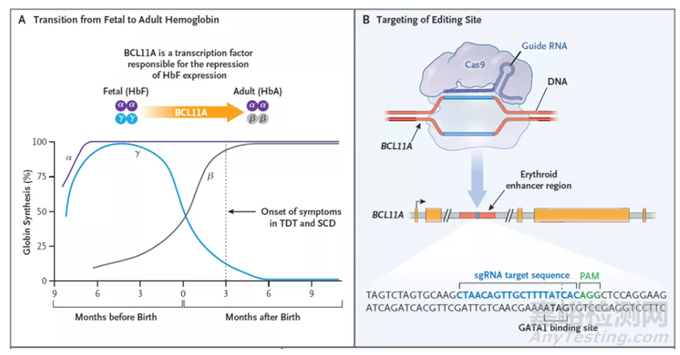 ▲Casgevy的作用機(jī)制:A,BCL11A是下調(diào)胎兒血紅蛋白表達(dá)的轉(zhuǎn)錄因子;B,Casgevy通過(guò)對(duì)BCL11A進(jìn)行基因編輯,上調(diào)胎兒血紅蛋白的表達(dá)(圖片來(lái)源:參考資料[2])