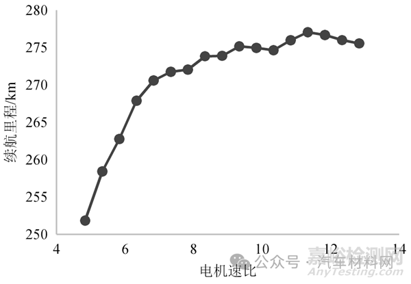 另一方面,傳動系速比設(shè)計也可以影響電機(jī)運(yùn)行點(diǎn)的位置,在電機(jī)運(yùn)行點(diǎn)不同位置具有不同的電機(jī)效率進(jìn)而可以影響到整車?yán)m(xù)航里程,如圖3所示,所以在滿足電動車爬坡和最高車速的前提下,可以通過調(diào)整不同速比提高續(xù)航里程。