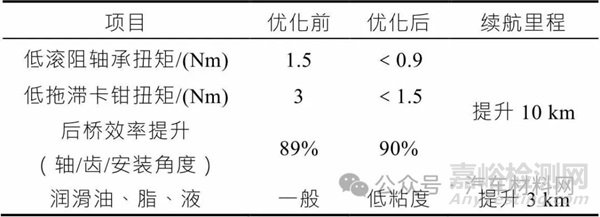 傳動系統(tǒng)效率損失的表現(xiàn)為存在機(jī)械內(nèi)阻,一般通過摩擦損失轉(zhuǎn)化為熱量散失,因此,提高傳動系效率也可有效提升續(xù)航里程。以某車型為例,優(yōu)化后的續(xù)航里程貢獻(xiàn)見表2。