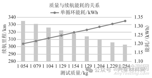 為比較某車型整備質(zhì)量對續(xù)航里程的影響,將整備質(zhì)量按25 kg步長,應(yīng)用AMESim仿真軟件逐個計算某車型在不同質(zhì)量下的續(xù)航里程變化,如圖4所示。結(jié)果表明質(zhì)量每減少25 kg,續(xù)航里程可增加3~4 km。