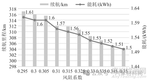 同樣,為比較某車型風(fēng)阻系數(shù)對續(xù)航里程的影響,將風(fēng)阻系數(shù)按每0.005步長,應(yīng)用AMESim仿真軟件逐個計算某車型在不同風(fēng)阻系數(shù)下的續(xù)航里程變化,如圖5所示。結(jié)果表明風(fēng)阻系數(shù)每減少0.005,通過仿真計算得出目標(biāo)車型每個測試循環(huán)能耗降低0.01~0.03 kWh/100 km,即續(xù)航里程可增加1.5~1.6 km。