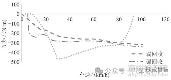 整車控制策略優(yōu)化一種方式是通過控制油門踏板與負(fù)荷的關(guān)系曲線使電池、電機(jī)工作在高效區(qū)間,需要根據(jù)電池的放電特點(diǎn)和電機(jī)Map圖得到其高效工作區(qū)域,然后不斷調(diào)整油門踏板與負(fù)荷的關(guān)系,使其達(dá)到續(xù)航里程最優(yōu)的狀態(tài)[5]。另一種方式是增大能量回收強(qiáng)度來實(shí)現(xiàn),如圖6所示,強(qiáng)回收模式表示在續(xù)航測試中減速時基本不需要制動踏板制動,而利用滑行能量回收達(dá)到制動,而弱回收在減速過程中需要踩制動踏板,通過制動能量回收。
