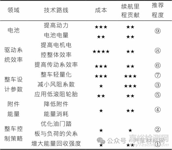 根據(jù)技術(shù)成熟度、行業(yè)發(fā)展情況,以及綜上所述續(xù)航里程貢獻(xiàn),若從微型純電動汽車產(chǎn)品性價比角度出發(fā),當(dāng)前階段推薦按表3所示技術(shù)路徑提升續(xù)航里程。