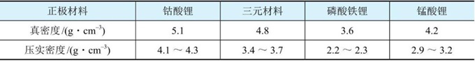 幾種商業(yè)正極材料的真密度和壓實(shí)密度范圍
