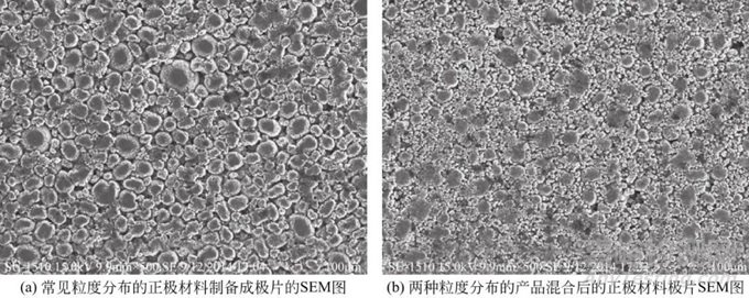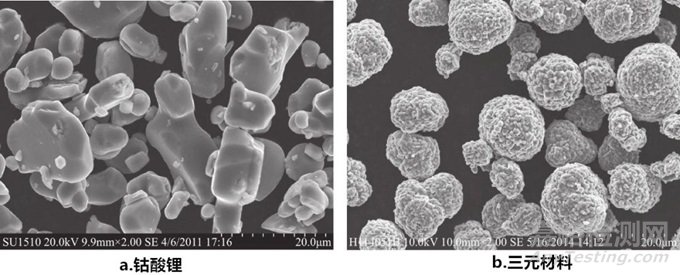 三元材料和鈷酸鋰的真密度差別并不大,從上表可以看出,NCM111和鈷酸鋰的真密度只差0.3g·cm-3,壓實(shí)密度卻比鈷酸鋰低0.5g·cm-3,甚至更高,導(dǎo)致這個(gè)結(jié)果的原因很多,但最主要的原因是鈷酸鋰和三元材料的形貌差別。