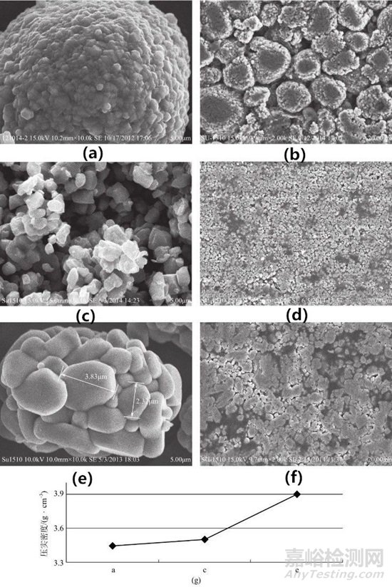 圖中(a)、(c)、(e)三種形貌的材料對(duì)應(yīng)的壓實(shí)密度結(jié)果對(duì)應(yīng)(g)中的a、c、e。從圖中可以看出,(a)形貌的材料壓實(shí)密度最低,但和(c)的壓實(shí)密度相差不多,(e)的壓實(shí)密度比(a)和(c)的高很多,已經(jīng)達(dá)到3.9g·cm-3。