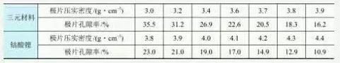 三元材料和鈷酸鋰在不同壓實(shí)密度下的孔隙率典型值