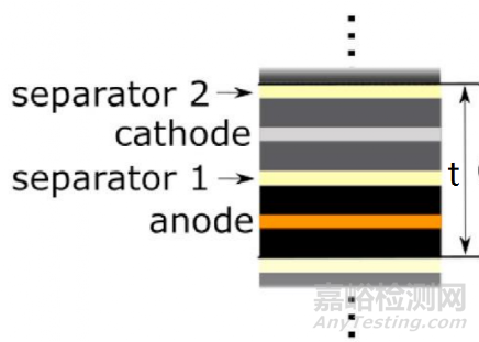 t是卷芯中基本組成單元的厚度,對(duì)于圓柱形電池,t相當(dāng)于正極、負(fù)極極片的厚度和兩層隔膜的厚度,如圖1所示。