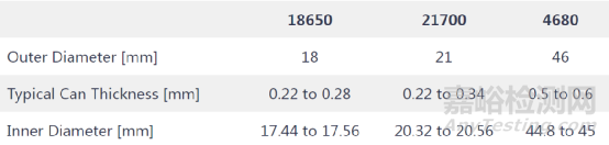 常見(jiàn)的圓柱電池外徑、殼體厚度和殼體內(nèi)部空間直徑如下表所示。