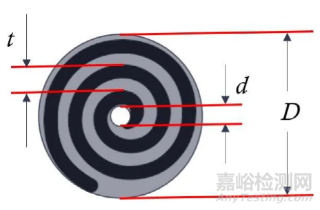 根據(jù)以上公式分別計(jì)算內(nèi)核弧線長(zhǎng)度和整體的弧線長(zhǎng)度,兩者差值約為為長(zhǎng)度。因此,如圖2所示,已知卷芯內(nèi)核直徑d,卷芯外徑D,卷芯中基本組成單元的厚度t正極、負(fù)極極片的厚度和兩層隔膜的厚度之和。