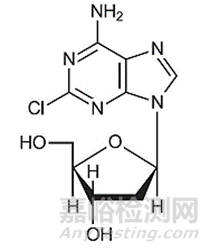 克拉屈濱(Cladribine),又名2-氯-2'-脫氧腺苷(2-chloro-2'-deoxyadenosine,2-CdA)是脫氧腺苷的核苷酸類似物(結(jié)構(gòu)式如圖1所示),其對(duì)多發(fā)性硬化癥的治療作用機(jī)制尚未完全闡明,但通常認(rèn)為該藥在體內(nèi)可以被淋巴細(xì)胞攝取,干擾細(xì)胞中DNA的合成,從而對(duì)B淋巴細(xì)胞和T淋巴細(xì)胞產(chǎn)生細(xì)胞毒性作用(淋巴細(xì)胞在MS發(fā)病過程中起著關(guān)鍵作用),導(dǎo)致淋巴細(xì)胞耗竭,進(jìn)而減緩MS進(jìn)展。
