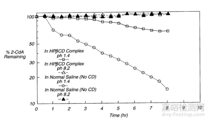 口服給藥是最易被患者接受的一種給藥途徑,給藥方便,患者依從性高,但克拉屈濱口服給藥存在生物利用度低以及個(gè)體間差異較大等問題。此外,克拉屈濱在弱堿性和中性pH條件下穩(wěn)定,但在酸性pH下會(huì)隨時(shí)間發(fā)生顯著水解,當(dāng)pH=2時(shí)(37℃),6小時(shí)后克拉屈濱含量為13%,而pH=1時(shí)(37℃),2小時(shí)后克拉屈濱含量?jī)H為2%。Schultz等人發(fā)現(xiàn)將克拉屈濱制成羥丙基-β-環(huán)糊精(HP-β-CD)包合物后可顯著提高克拉屈濱對(duì)酸的穩(wěn)定性(如圖2所示)。