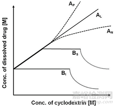 在環(huán)糊精包合物的研究過程中,常進(jìn)行相溶解度實(shí)驗(yàn)(phase solubility study)來確定藥物分子與所選環(huán)糊精的包合類型,該法最早由Higuchi和Connors提出。方法是配制不同濃度的環(huán)糊精溶液,加入過量的藥物,繪制不同環(huán)糊精濃度下藥物的飽和溶解度曲線。根據(jù)相溶解度圖可以將藥物與環(huán)糊精的包合情況分為A型和B型(如圖3所示)。A型表示藥物濃度隨環(huán)糊精濃度增大而增大,表現(xiàn)為增溶作用,它可進(jìn)一步分為AL,Ap和AN三種亞型。若環(huán)糊精對(duì)藥物以1: 1配比進(jìn)行包合,相溶解度圖呈線性增加,表現(xiàn)為AL型,而Ap型和AN型分別為線性增加的正偏差和負(fù)偏差,前者表明在較高的環(huán)糊精濃度下對(duì)藥物的增溶能力更強(qiáng),而后者表明在較高的環(huán)糊精濃度下對(duì)藥物的增溶能力更弱。B型分為Bs和Bl兩個(gè)亞型,Bs型為隨環(huán)糊精濃度增加,藥物溶解度先上升,再經(jīng)歷平臺(tái)期,最后由于微晶態(tài)的包合物沉淀出現(xiàn)而下降;Bl型為隨環(huán)糊精濃度增加,藥物溶解度起初不變,然后逐漸下降,表明難溶性包合物的形成。