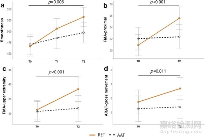 總體結(jié)果: RET比AAT在平滑度方面有更大的改善(p = 0.006)。FMA-上肢(p < 0.001),F(xiàn)MA-近端(p < 0.001),ARAT-總運(yùn)動(dòng)(p = 0.011),關(guān)節(jié)獨(dú)立性的運(yùn)動(dòng)學(xué)變量(p = 0.017)和位移(p = 0.011)在RET組干預(yù)結(jié)束時(shí)也有更多的改善。