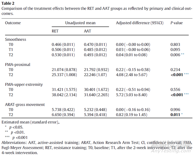 結(jié)論:在中度腦卒中患者中,機(jī)器人RET在改善上肢功能、結(jié)構(gòu)和活動(dòng)方面比AAT更有效。