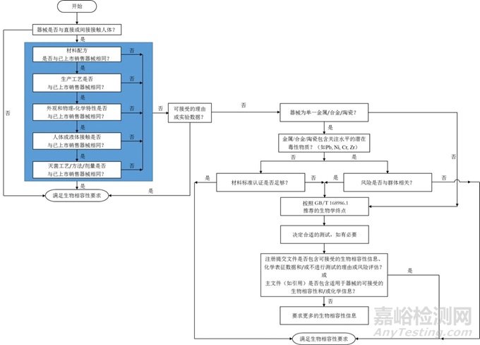根據(jù)121號文,無論是否進(jìn)行生物學(xué)實(shí)驗(yàn),都需要先提交生物學(xué)評價(jià)報(bào)告。作者前文撰寫過多篇關(guān)于生物學(xué)評價(jià)的文章,淺談醫(yī)療器械生物學(xué)評價(jià)操作SOP、醫(yī)療器械原材料變化生物學(xué)評價(jià)、無源植介入類醫(yī)療器械技術(shù)審評生物學(xué)關(guān)注點(diǎn)、醫(yī)療器械生物學(xué)評價(jià)路徑選擇、醫(yī)療器械生物學(xué)評價(jià)的技術(shù)評審關(guān)注點(diǎn)、醫(yī)療器械生物相容性評價(jià)、醫(yī)療器械設(shè)計(jì)開發(fā)流程及質(zhì)量體系核查要求等,可參考之前撰寫的內(nèi)容進(jìn)行。詳細(xì)的不在此贅述,按照下圖的方式開展生物學(xué)評價(jià)。