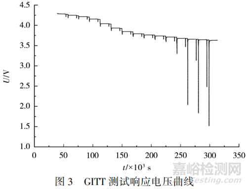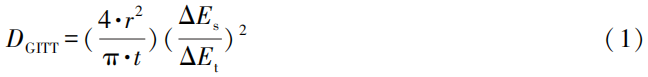 GITT測試是在一定SOC的平衡狀態(tài)下,以恒定短電流脈沖來激勵電池,在脈沖期間和電流脈沖之后的松弛期間記錄電壓。在變化的電壓中,歐姆壓降僅充當(dāng)一個常數(shù)。該常數(shù)會偏移所測量的電壓,但不會改變曲線的形狀。忽略反應(yīng)動力學(xué)的影響,假定將恒定電流短脈沖期間的電壓變化減去歐姆壓降后得到的電壓變化,是由濃度梯度的形成所致,并符合一維菲克擴(kuò)散定律,在小電流I及電勢E與t成線性關(guān)系的條件下,可由式(1)得出Li+擴(kuò)散系數(shù)DGITT的數(shù)值: