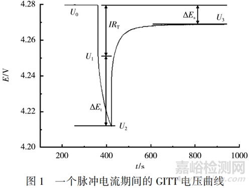 一個脈沖期間內(nèi)的電壓曲線見圖1。圖1中:U0為電池在某個SOC下靜置一段時間后的平衡電壓。在施加小電流I時,由于電池內(nèi)阻RT產(chǎn)生瞬時歐姆壓降,電壓下降至U1,接著,下降至最低點U2;撤去電流脈沖后,電壓回彈,最終在長時間靜置后回到平衡電壓U3。