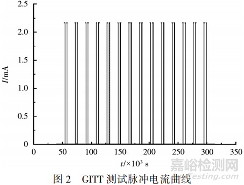 具體測試方法為:用電池測試系統(tǒng)進(jìn)行測試,在每一個給定的SOC點,以0.50C短脈沖電流激勵60s,靜置1h,至電壓達(dá)到穩(wěn)定后,以0.50C激勵電流持續(xù)一定的時間,到達(dá)下一個指定的SOC點,靜置4h,使電池內(nèi)部達(dá)到均衡狀態(tài)。循環(huán)上述過程,直至達(dá)到截止電壓。25℃下,充電工況的GITT測試脈沖電流見圖2。