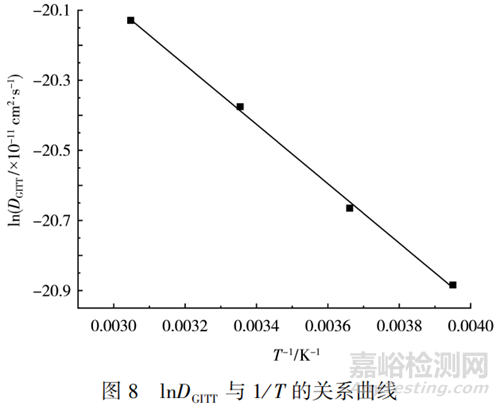 圖8中擬合得到的相關(guān)系數(shù)的平方為0.9986,表明lnDGITT與溫度有較強(qiáng)的線性關(guān)系。由式(3)計算得到的Li+在正極活性物質(zhì)中擴(kuò)散的活化能為7.061 kJ/mol。活化能為正,說明Li+擴(kuò)散系數(shù)隨著溫度的上升而增大,且較低的活化能壁壘有利于Li+在活性物質(zhì)中快速發(fā)生擴(kuò)散。