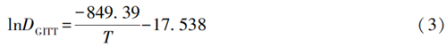 從圖8可知,lnDGITT與1/T呈線性關(guān)系,擬合得到的表達(dá)式見式(3)。