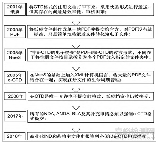 在2001年時,美國注冊申報方式主要是將CTD格式的注冊文檔打印下來,采用快遞形式進行運送,但其存在的問題是效率低,審核困難;為了提高審評效率,縮短審評周期,2003年,美國FDA開始接受使用eCTD V3.0 進行遞交,2005年美國可接受的藥品注冊申請電子提交格式包括 e-NDA和e-ANDA格式( PDF文件)、e-CTD 格式和NeeS格式等。在2008年1月,F(xiàn)DA規(guī)定e-CTD是唯一允許電子提交的格式,當然,在當時FDA的紙質(zhì)檔案也是接受的,也就是說,2008年,F(xiàn)DA進入e-CTD和紙質(zhì)檔案共存過程;這一過程持續(xù)了接近9年;在2017年5月15日起,所有的新藥申請( NDA) 、仿制藥申請( ANDA) 、生物制品申請(BLA) 及其補充申請必須以強制 e-CTD 格式提交;2018年5月5日,F(xiàn)DA要求商業(yè)化IND和藥品主文件( DMF,3 類DMF除外)申報資料必須以 e-CTD 格式提交,其他所有格式將被拒絕填寫,F(xiàn)DA在2018年全面進入e-CTD階段。