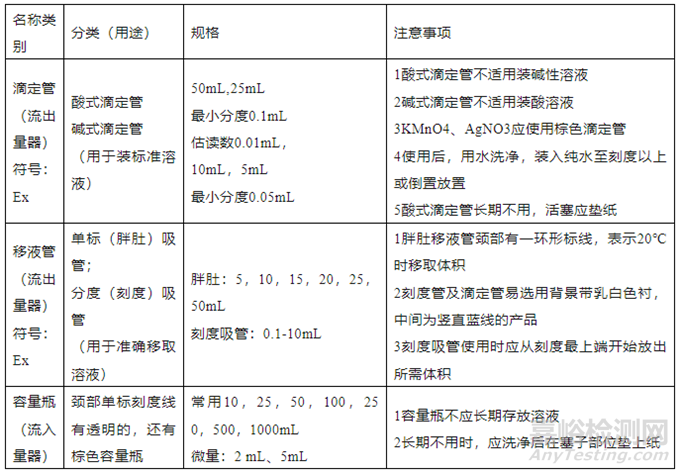 1、滴定管、移液管、容量瓶(20℃時流出流入準確液體體積的量器)