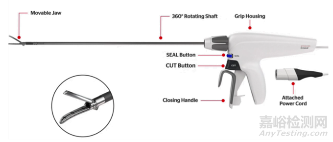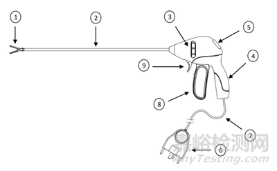 其中,1.鉗口,2.軸,3.轉(zhuǎn)輪,4.手柄,5.能量激發(fā)按鈕,6.智能連接器,7.電纜,8.杠桿,9.切割扳機(jī)。某些大血管閉合器械還具有RFID等識(shí)別裝置,與閉合設(shè)備連接時(shí)可以用于識(shí)別器械型號(hào)和編號(hào),也可以用于記錄器械使用次數(shù)。