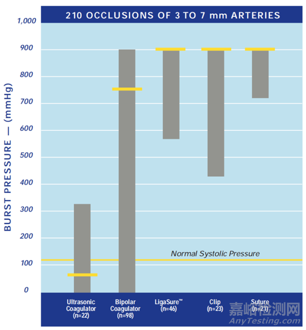 該融合機(jī)制下所產(chǎn)生的閉合可以承受非常高的爆破壓,是正常人體動(dòng)脈收縮壓的三倍以上。研究表明LigaSure大血管閉合系統(tǒng)爆破壓強(qiáng)度在統(tǒng)計(jì)學(xué)上比超聲刀和雙極更高,跟結(jié)扎夾和縫線類似。(黃色:中值爆破壓)