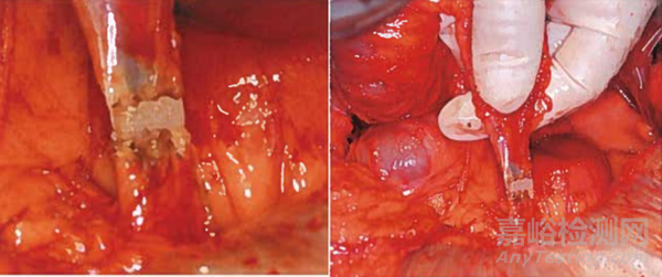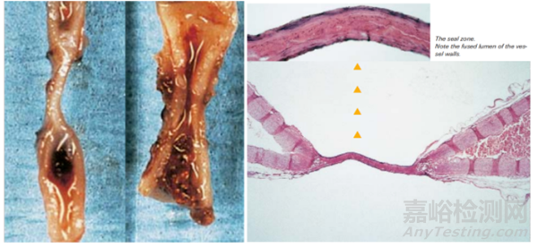 圖5.頸動(dòng)脈縱切面(左),動(dòng)物實(shí)驗(yàn)中H & E染色的腎動(dòng)脈閉合帶縱切面(右)