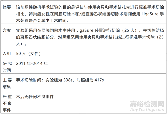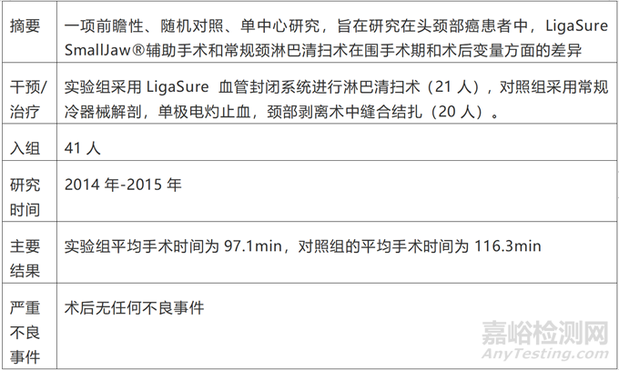 于http://clinicaltrials.gov檢索“LigaSure”,(檢索時(shí)間:2024.01.19),已開(kāi)展臨床試驗(yàn)有34條記錄,其中已完成的臨床試驗(yàn)有22條記錄,應(yīng)用的領(lǐng)域涉及:肝切除、頭頸部腫瘤、結(jié)腸/直腸疾病、痔瘡切除、甲狀腺疾病、宮頸癌、卵巢癌、子宮癌,其中有5個(gè)臨床試驗(yàn)發(fā)布實(shí)驗(yàn)結(jié)果,有詳細(xì)實(shí)驗(yàn)結(jié)果的臨床試驗(yàn)如下: