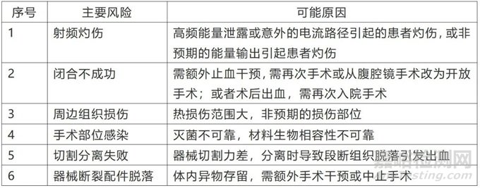 同時(shí),根據(jù)LigaSure大血管閉合的預(yù)期用途、結(jié)構(gòu)等方面特點(diǎn),可以識(shí)別出該類設(shè)備的臨床常見(jiàn)風(fēng)險(xiǎn)點(diǎn)為:1)射頻灼傷;2)閉合不成功;3)熱損傷范圍過(guò)大引起的非預(yù)期的損傷部位;4)手術(shù)部位感染;5)切割分離失?。?)器械斷裂配件脫落。
