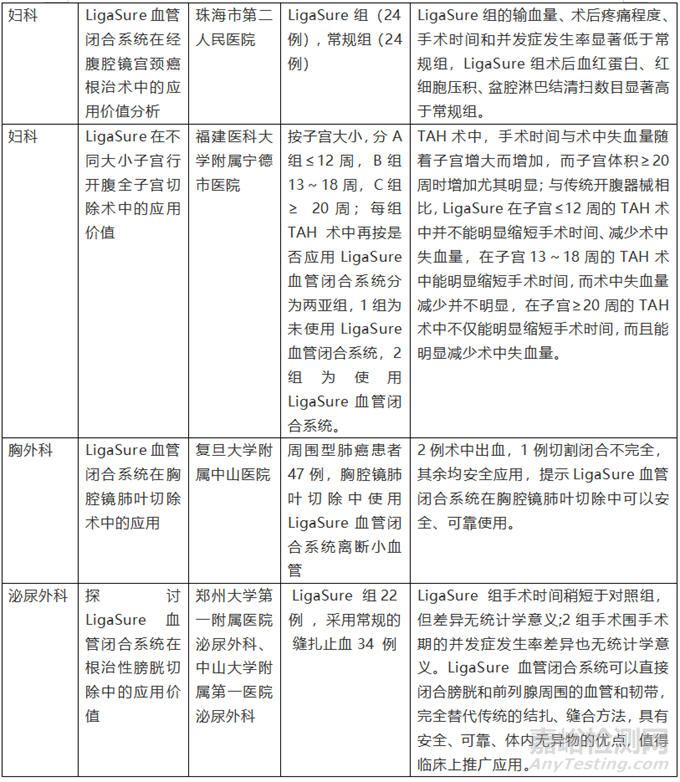 LigaSure產(chǎn)品在實(shí)際臨床中應(yīng)用較為廣泛,可有效縮短手術(shù)時(shí)間,減少術(shù)中出血等。通過(guò)文獻(xiàn)資料檢索,整理部分LigaSure產(chǎn)品臨床使用情況。