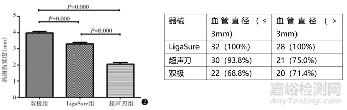 表3.雙極組、LigaSure組、超聲刀組對(duì)人子宮旁血管組織的熱損傷寬度