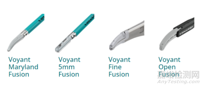 Applied Medical公司產(chǎn)品大血管閉合器Voyant是一款高級(jí)雙極電刀,和美敦力LigaSure一樣能夠收集有關(guān)其鉗口內(nèi)組織性質(zhì)的信息,在施加能量時(shí)快速持續(xù)地測(cè)量組織,并進(jìn)行調(diào)整以在整個(gè)密封周期中提供最佳能量,以形成永久的融合,能夠閉合最大血管直徑為7mm。Voyant由刀頭和主機(jī)組成,其中刀頭由四款類型,分別是Voyant Maryland Fusion、 Voyant 5mm Fusion 、 Voyant Fine Fusion和Voyant Open Fusion 。這四款產(chǎn)品能夠和美敦力LigaSure產(chǎn)品能夠一一對(duì)應(yīng)。