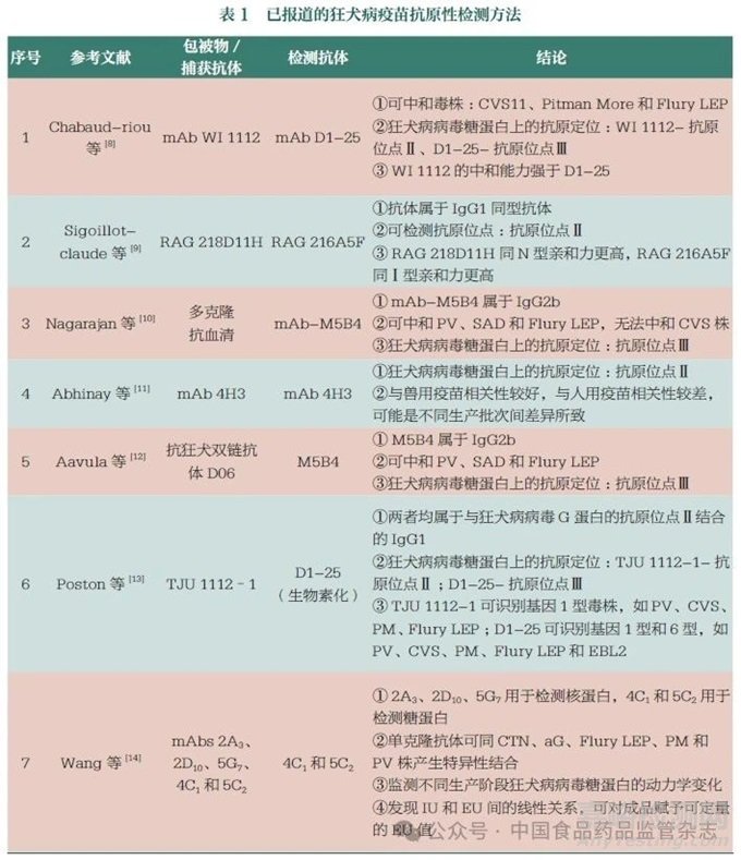 狂犬病病毒抗原含量是關(guān)系到狂犬病疫苗有效性的重要因素。糖蛋白是狂犬病病毒唯一能誘導(dǎo)宿主產(chǎn)生中和抗體并與之結(jié)合的蛋白。世界衛(wèi)生組織(WHO)推薦體外方法,即通過對糖蛋白定量進(jìn)行狂犬病疫苗的效力測定[6-7]。相比需要使用大量小鼠、檢測時(shí)間長、對操作人員技術(shù)要求高、檢測方法變異性大的NIH 體內(nèi)方法,體外方法可以有效減少檢測時(shí)長和實(shí)驗(yàn)動物的使用量,具有易操作、方法穩(wěn)定等優(yōu)點(diǎn)。國內(nèi)外學(xué)者通過選擇不同的、具有中和活性的單克隆抗體,建立了多個(gè)檢測方法(表1)[8-14],而且與NIH 體內(nèi)方法具有較好的相關(guān)性。但由于所使用的狂犬病病毒株、生產(chǎn)工藝、疫苗類型(人用疫苗或獸用疫苗、是否含有佐劑等)、所使用單克隆抗體識別抗原位點(diǎn)存在差異等因素,目前尚未有統(tǒng)一的檢測方法可用于所有毒種生產(chǎn)的狂犬病疫苗抗原性檢測。