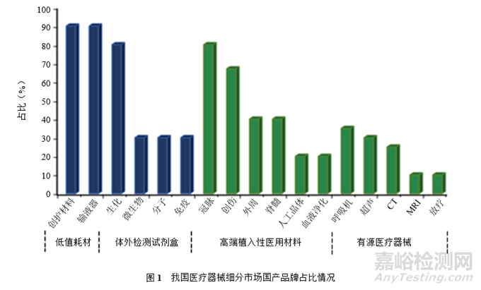 國(guó)際管理咨詢公司羅蘭貝格于2023年發(fā)布的《中國(guó)醫(yī)療器械行業(yè)發(fā)展現(xiàn)狀與趨勢(shì)》報(bào)告中指出,我國(guó)醫(yī)療器械市場(chǎng)規(guī)模從2021年的8 438億元躍升至2022年的9 582億元,近7年復(fù)合增速約17.5%。但從藥品和醫(yī)療器械人均消費(fèi)額的比例(藥械比)角度看,我國(guó)目前藥械比僅為2.9,與全球平均藥械比(1.4)水平仍有一定差距,表明我國(guó)醫(yī)療器械市場(chǎng)未來(lái)存在較大的增長(zhǎng)空間。報(bào)告還指出,目前我國(guó)80%~90%高端醫(yī)療器械都依賴于進(jìn)口,如放療設(shè)備、MRI等。我國(guó)醫(yī)療器械細(xì)分市場(chǎng)國(guó)產(chǎn)品牌占比情況見(jiàn)圖1。雖然有部分醫(yī)療器械已經(jīng)實(shí)現(xiàn)了國(guó)產(chǎn)化,但其部分核心零部件、原材料、制造設(shè)備和檢測(cè)設(shè)備等仍依賴進(jìn)口。