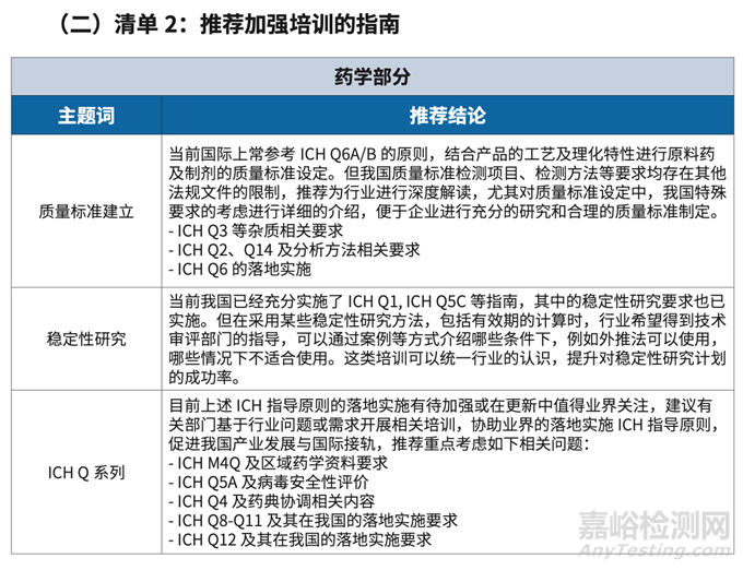 結(jié)合調(diào)研及深度訪談的結(jié)果,對部分行業(yè)反饋的問題,可以通過加強(qiáng)培訓(xùn)的方式,使得行業(yè)對指南中的描述有更充分的理解,便于行業(yè)的理解。同時(shí),高效率的使用審評資源,也減少 審評部門對這類共性問題,單獨(dú)與企業(yè)解決,節(jié)省審評資源。為此,課題組推薦在 9 個(gè)與 ICH 及我國相關(guān)技術(shù)指南相關(guān)的話題,加強(qiáng)行業(yè)培訓(xùn),包括藥品質(zhì)量標(biāo)準(zhǔn)建立、穩(wěn)定性研究等。