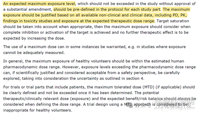 先看下EMA相關(guān)資料,2018年2月EMA發(fā)布了《Guideline on strategies to identify and mitigate risks for first-in-human and early clinical trials with investigational medicinal products》。指南中Section 7.5關(guān)于Maximum exposure and dose的原文如下: