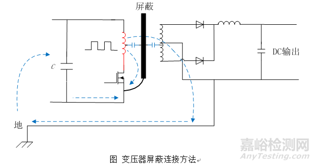因?yàn)楣材k妷涸吹膮⒖键c(diǎn)MOS管的源極,因此屏蔽層應(yīng)連接到MOS管的源極,這為共模電流提供了一條低阻抗的分流路徑,這樣更多的共模電流通過(guò)屏蔽層及其接地線(xiàn)回到MOS管的源極,這部分共模電流不會(huì)導(dǎo)致傳導(dǎo)發(fā)射,剩下的共模電流從散熱器到機(jī)箱再經(jīng)過(guò)LISN回流,這部分共模電流對(duì)傳導(dǎo)發(fā)射才會(huì)有貢獻(xiàn)。