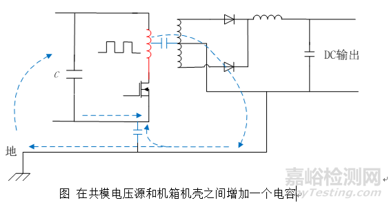 (3)在變壓器的副邊電壓參考點(diǎn)和MOS管的源極之間增加一個(gè)電容。加入電容使得原本要流過(guò)輸出電源線(xiàn)的共模電流直接旁路回共模電壓源,從而減小了流向輸出回路的共模電流。