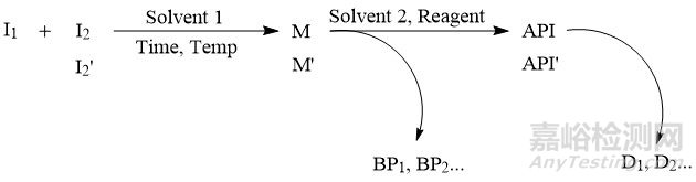 原料藥中有機(jī)雜質(zhì)的來源往往通過合成工藝路線來綜合分析,比如圖1是一個(gè)化學(xué)原料藥的合成工藝示意圖,根據(jù)此反應(yīng)路線,原料藥中有機(jī)雜質(zhì)的潛在來源主要包括以下幾個(gè)方面:①起始物料(I1、I2)及中間體(M);②起始物料引入的雜質(zhì)(如I2′),以及起始物料引入雜質(zhì)的后續(xù)反應(yīng)產(chǎn)物,如I2′的后續(xù)反應(yīng)產(chǎn)物M′、API′;③副產(chǎn)物,如BP1、BP2等等,如果副產(chǎn)物可隨主成分一同參與后續(xù)的反應(yīng),還需關(guān)注其后續(xù)反應(yīng)產(chǎn)物;④原料藥的降解產(chǎn)物,如D1、D2等等;⑤反應(yīng)中使用的試劑、配位體、催化劑等等。由于降解產(chǎn)物的化學(xué)結(jié)構(gòu)一般與活性成分類似或具有淵源關(guān)系,通常也稱為有關(guān)物質(zhì)。除了降解產(chǎn)物外,其他4類有機(jī)雜質(zhì)都與制備工藝有關(guān),也稱為工藝雜質(zhì)。