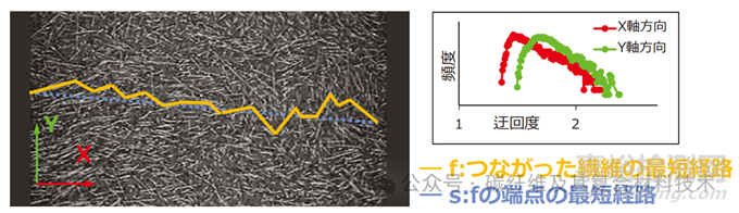 如上圖1在顯示CFRP內(nèi)部空隙存在部位的同時,還可以通過計算得到CFRP體積的空隙率為0.9%。而在圖2所示的測試結(jié)果中,從表示纖維定向的迂回度來看,可以對偏移X方向的纖維進(jìn)行定向。