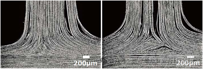 圖3熱塑性CFRP熔接部位的X線CT觀察圖像:左圖:高強度產(chǎn)品,右圖:低強度產(chǎn)品