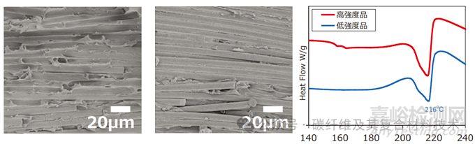 圖4 CFRP熔接部強度試驗后的剝離面分析結(jié)果,左:高強度產(chǎn)品的斷裂面SEM像,中:低強度產(chǎn)品的斷裂面SEM像,右:斷裂面附近的樹脂DSC測定結(jié)果